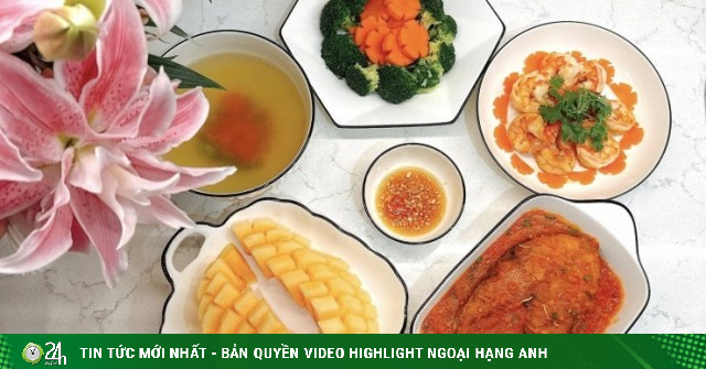 - Cá thu sốt cà chua, tôm rim, súp lơ và cà rốt luộc, cùng dưa vàng.