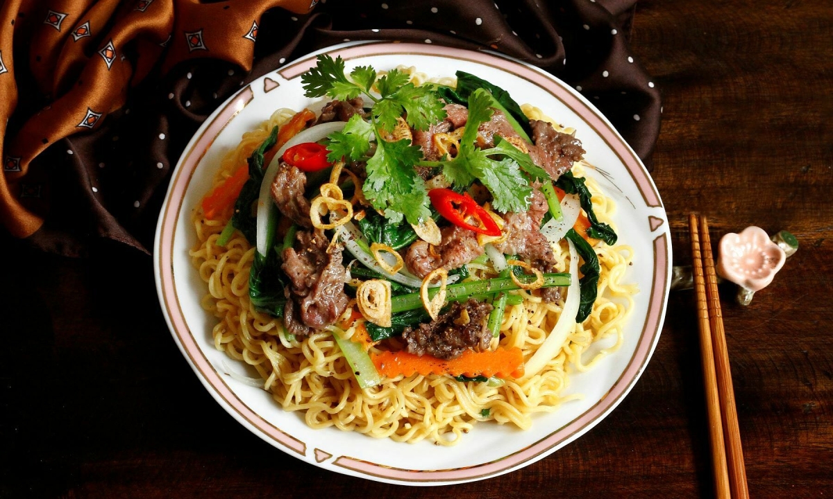 Mì xào thịt bò và rau cải. Ảnh: Bùi Thủy