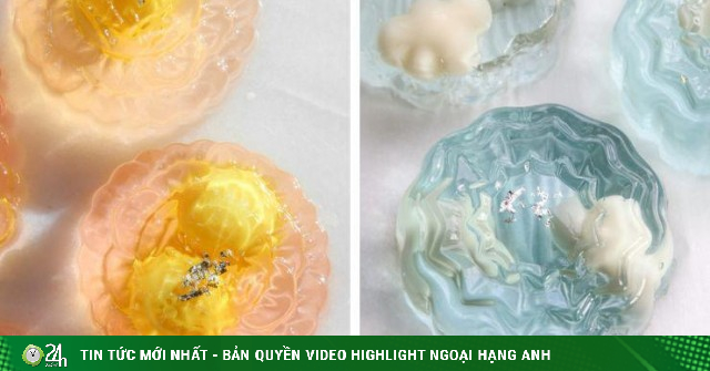 Khi đã đủ thời gian đông, lấy bánh ra ngoài và nhúng khuôn vào nước ấm khoảng 15 giây. Gõ nhẹ lên bàn để thạch tách ra khỏi khuôn. Bánh trung thu rau câu sẽ có màu trong veo, mát lạnh, và khi cắt ra bạn sẽ thấy phần nhân rất đẹp mắt.